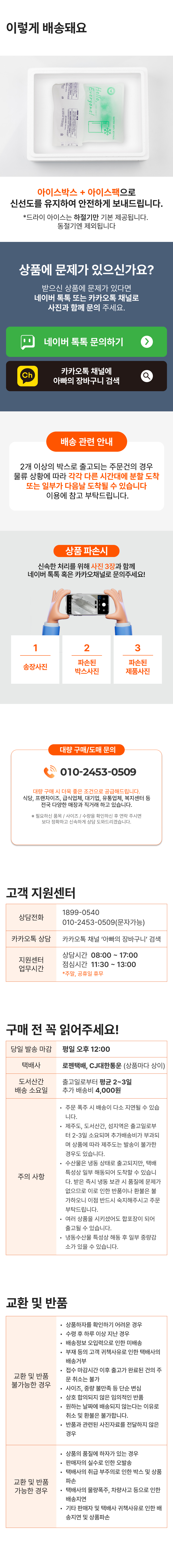 6. 단, 오배송, 변질, 택배 사고 등의 경우 제품 상태를 촬영하셔서 고객센터로 연락 주시면 신속히 처리해 드리겠습니다.